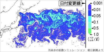 福島第1原発から海に流出した汚染水が3500km東の日付変更線まで広がっている推計結果を海洋研究開発機構が公表した。機構の升本順夫・短期気候変動応用予測研究プログラムディレクターらが、第1原発近くの海で測定された放射能濃度の値・海の対流・風向きの変化などから拡散状況を推定。その結果、11月1日時点で、放射性セシウム137は原発東方の沖合3500kmの日付変更線付近まで拡散しており、ほとんどは濃度が0・01〜0・5Bq/l、一部には1〜5Bq/lの場所もあった。事故前の平均的濃度は0・001Bq/l程度。