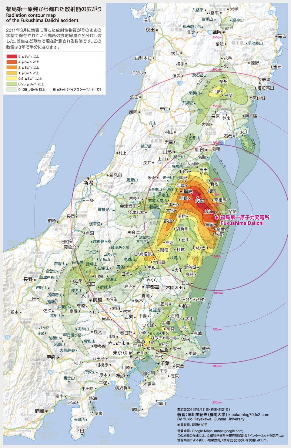 汚染地図の説明:国と地方自治体が、7000余りの地点で放射線量を測定してインターネットで公表している。福島県内だけでなく、関東地方全域と東北地方南部に及ぶ。測定点の位置を@nnistarさんがひとつ一つ地図上で確かめて、測定値ごとに色分けしてプロットした。私がそれをみて、0.25マイクロシーベルト毎時などの等値線を引いてつくったのがこの地図である。したがって、使ったデータはすべて国と自治体が測定したものである。@nnistarさんのページにデータ表が公開されている