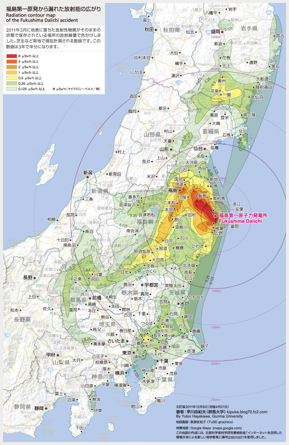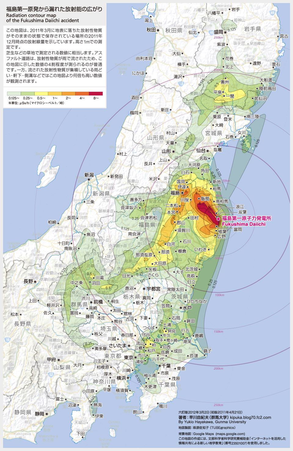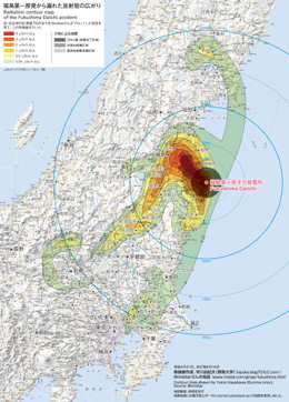 事故後の放射性微粒子の大気拡散を国と地方自治体の公表データをまとめた福島第1原発から半径約300kmの汚染地図があります。これは、群馬大学の火山学者・早川由紀夫氏のWebページで見ることができます。地図には地上1mの測定値で
