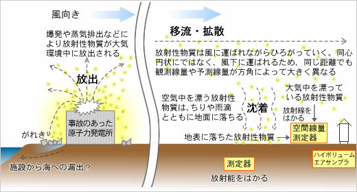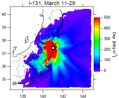 気象庁の気象研究所は計算を簡単にするため、一定量の放射性ヨウ素が出続けていると仮定。12日夜〜13日未明には南西風に運ばれて原発から宮城県沿岸部に向かい、太平洋に出た。15日未明からは北東風になったため関東に流れ、午前9時ごろには静岡県に達した。
