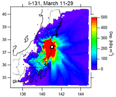 ヨウ素131は主にガス態で、大気から地表面へ直接沈着する乾性沈着により大気濃度と類似した沈着分布を示す。